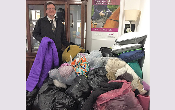 Our Funeral Arranger Justin Hydes has been overwhelmed by the Ledbury community’s response to his appeal for clothes, bedding and household items to help the homeless.